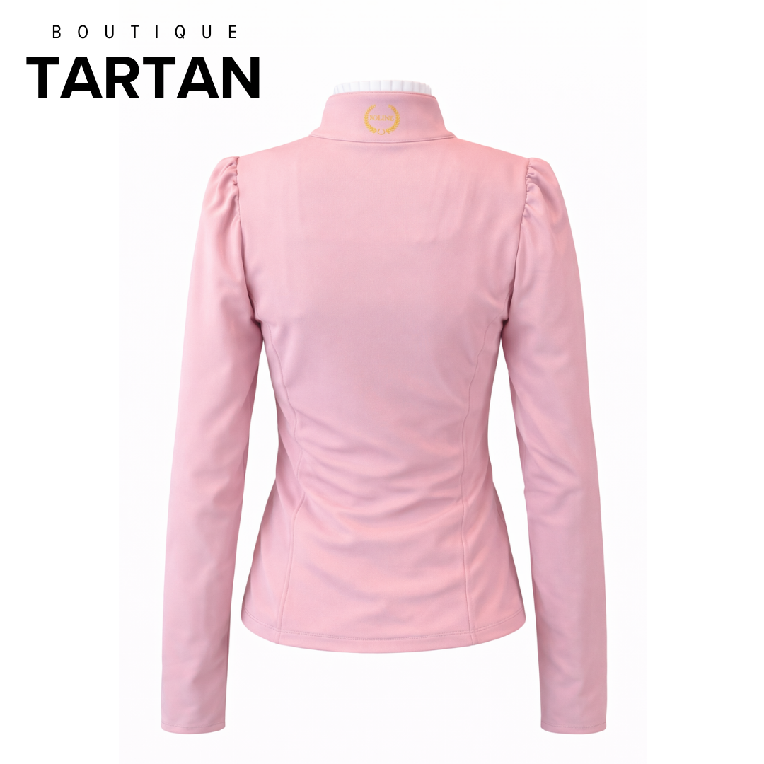 * Garniture à volants le long du col.